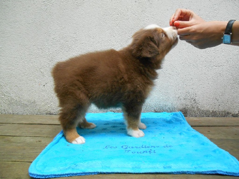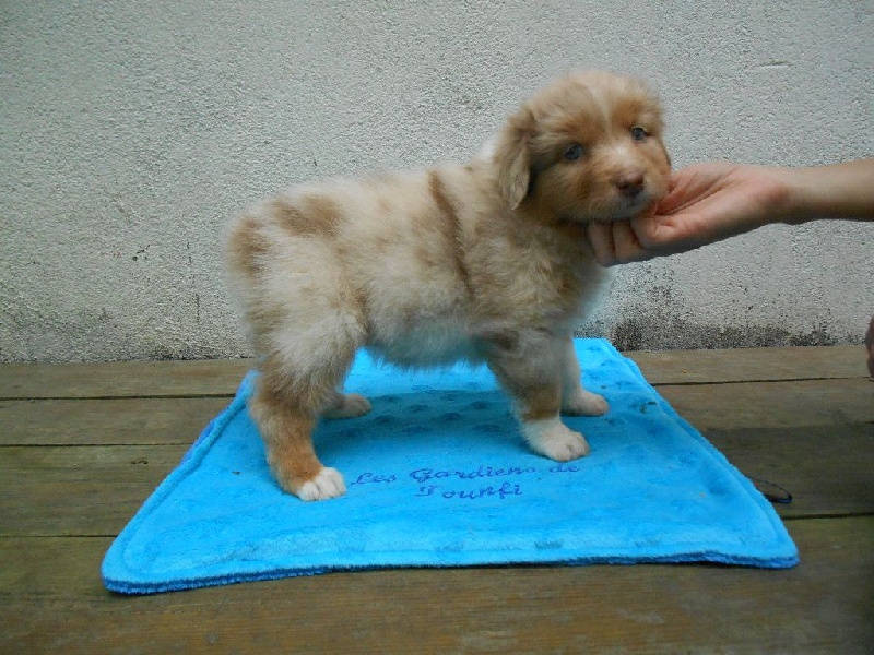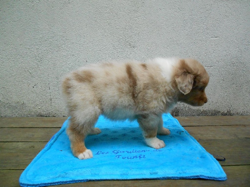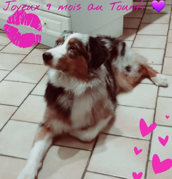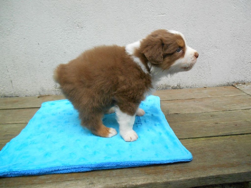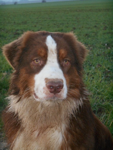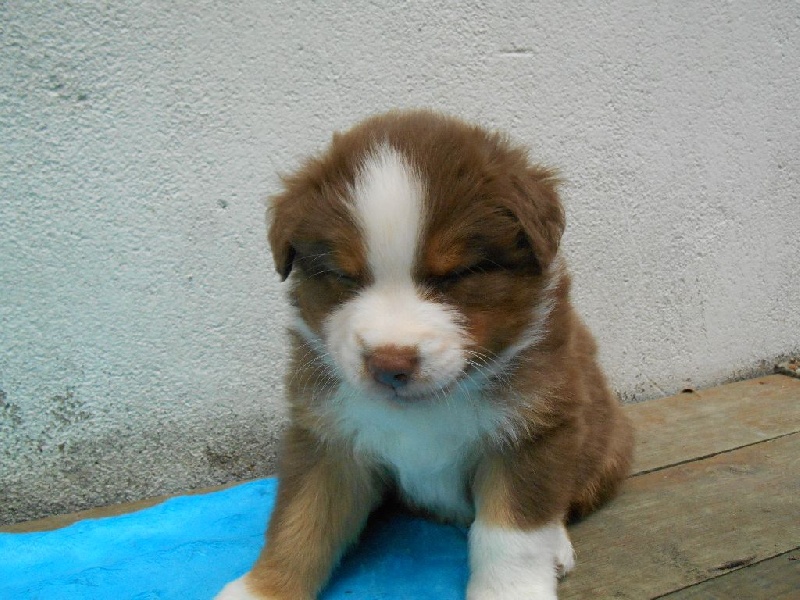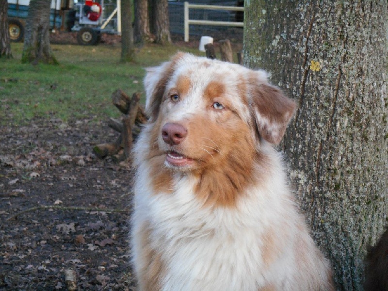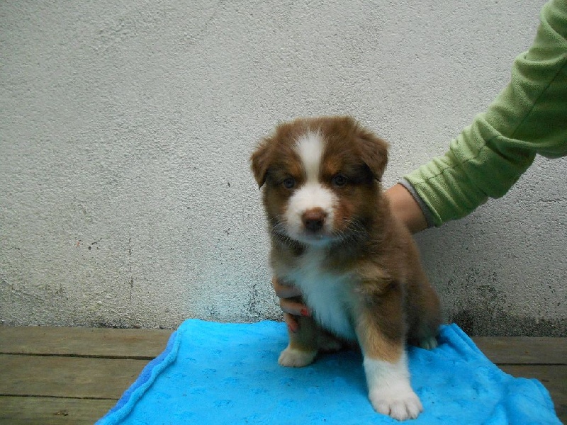 Belle femelle rouge merle avec très peu de blanc en tête. Queue écourtée. Est partie chez Sandrine pour faire de l'agility.