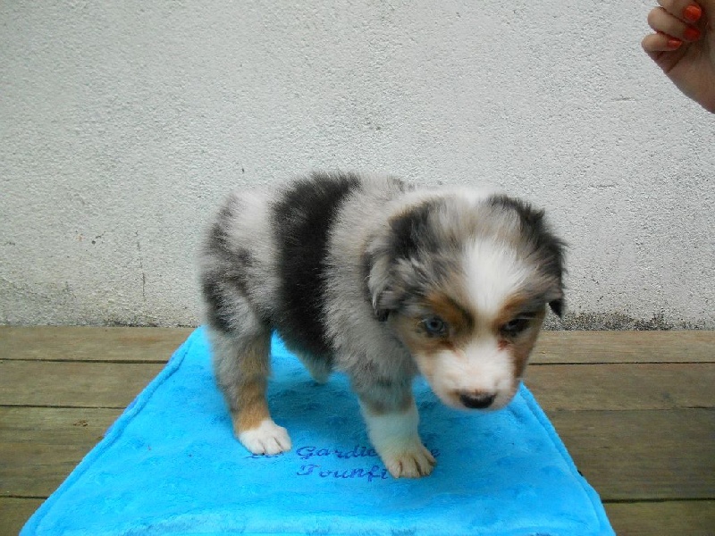 Belle femelle bleue merle avec des couleurs très soutenues et très peu de blanc. Queue écourtée.